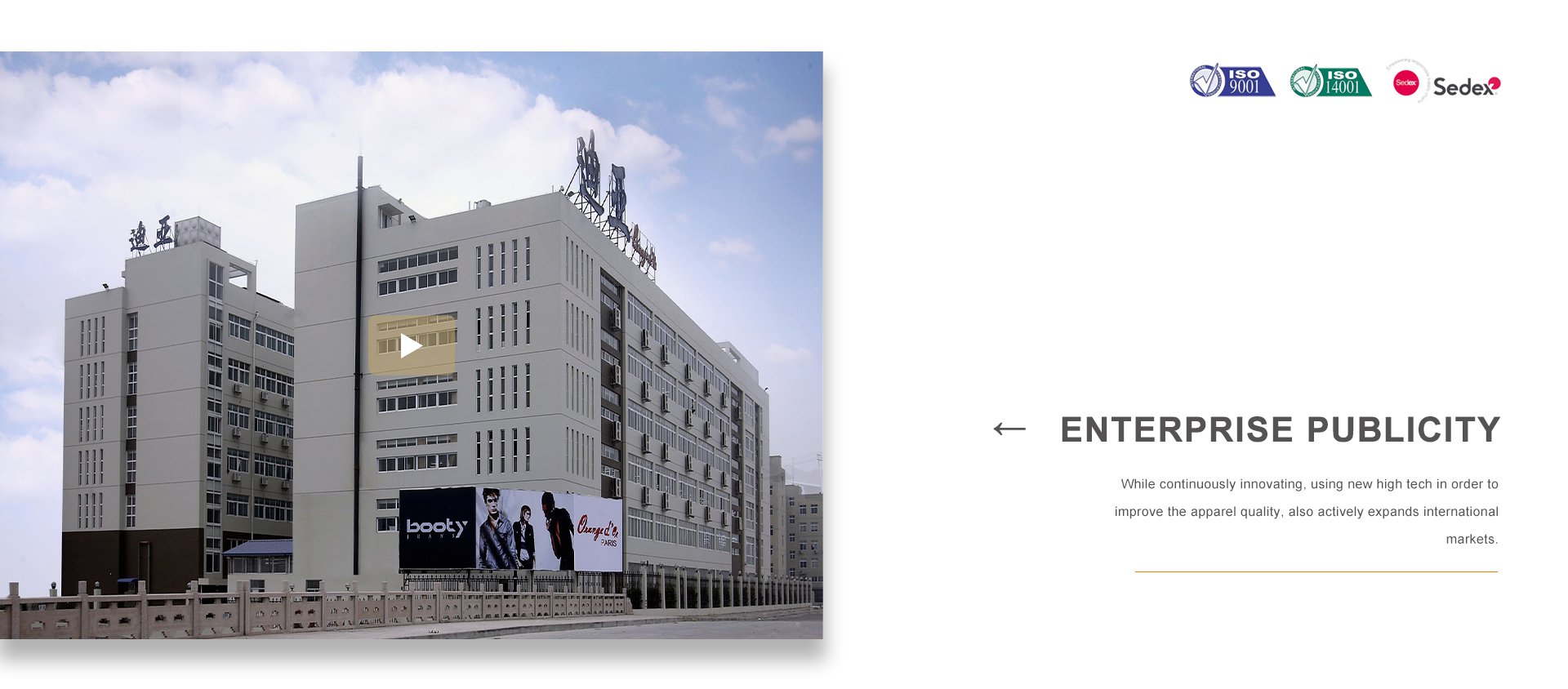浙江迪亞服飾有限公司于1998年在世界時尚品牌之都——法國巴黎二區(qū)應(yīng)運而生。同年,在浙江省甌海經(jīng)濟(jì)開發(fā)區(qū)東方南路28號設(shè)立服裝制造工廠。公司集服裝設(shè)計、生產(chǎn)、營銷、品牌于一體,在不斷創(chuàng)新、采用高新技術(shù)提高服飾質(zhì)量的同時,積極拓展國際市場,海外營銷部長期與LV集團(tuán)旗下的MAJE、SOEUR、BALIBARIS等國際著名品牌保持非常緊密的合作關(guān)系。品牌建設(shè)是公司堅持不懈的追求,我們每年都會積極參加國內(nèi)外舉辦的各大服裝展銷會。憑借著良好的質(zhì)量與信譽,市場占有率在逐漸擴(kuò)大,產(chǎn)品遠(yuǎn)銷歐洲、美洲、亞洲等國。公司以生產(chǎn)棉衣、羽絨服、派克、大衣、夾克、運動休閑服飾等為主,旗下主打品牌有 ORANGE D’OR 、CLAIRVAL、BOOTY JEANS 、S&V和SASAEC,各品牌服飾均以典雅的色彩、優(yōu)美的線條、卓越的魅力吸引著都市麗人,將時尚、經(jīng)典的潮流信息予以淋漓盡致的演繹。